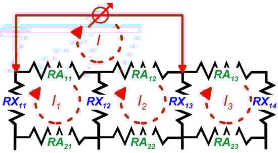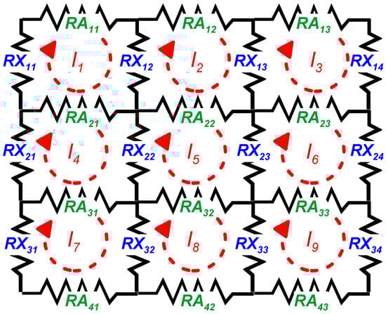 According to Figure 1, the horizontal resistors are marked as RA, and the vertical resistors are marked as RX. An example in Figure 1 presents a resistor network composed of nine current loops to illustrate how to build up the network’s linear equations. For simplicity, the network is without any current sources.
