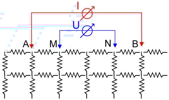 A scheme of a resistor network with an electrode array: current—A, B, and measuring—M, N electrodes.