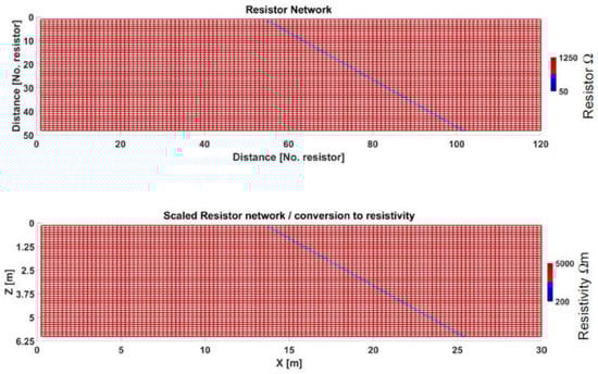 An example of a resistor network—a thin conductor in a high-resistivity medium. Upper: a resistor network made by single discrete resistors (colour scale equals single resistors’ resistance values). The length scale expresses the serial number of the resistors. Bottom: recalculated scheme according to geometrical scale factor—the size of mesh’s square is 0.25 m. The resistance values of resistors are recalculated to resistivities, and the axes x and z are expressed in length units.