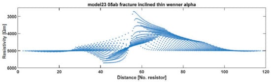 A similar group of three models was modeled using the resistor network model. It was reached by inserting the resistors corresponding to the fracture into all edges of the fracture’s cells used in the Res2Dmod calculation. In addition, the resistor network’s model enables fracture modeling in the form of a single resistor line. Such a model was created by regularly alternating and shifting the vertical and horizontal resistors. We call this model the ultra-thin fracture. The fracture steepness is the same as the three other models.