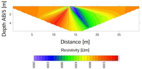 At the same time, the algorithm generates a data file that allows the creation of an apparent resistivity cross-section in the Surfer (ver. 28.3.296) software (Golden Software)—see Figure 7. The Surfer graphical output allows interactive editing of the final resistivity isoline cross-section.