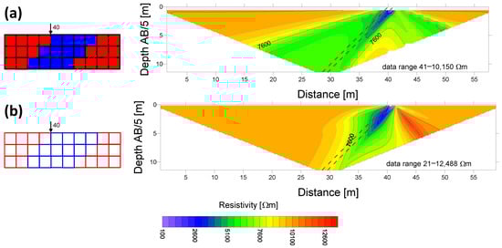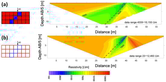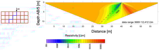 For the Res2Dmod calculation, three variants of the fracture’s thickness were chosen: fracture made of four cells in the horizontal direction (horizontal fracture’s width of 1 m), two cells (fracture width 0.5 m), and one cell (fracture width 0.25 m). The inclination of the fracture was chosen so that the side shift between cell layers was one cell. The first two models, therefore, create a continuous conductive strip (where adjacent cells share an edge). The third fracture model is built by cells mutually touching only their diagonal corners.