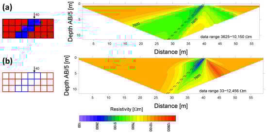 The different models with the resulting apparent resistivity cross-sections are displayed in Figure 8, Figure 9, Figure 10 and Figure 11. A pair of apparent resistivity cross-sections is presented for each model, first calculated by Res2Dmod and second by a resistor network model. The ultra-thin fracture model (the fourth resistor network model) is being compared with the third model calculated by Res2Dmod—Figure 11. All cross-sections were displayed with the same length/depth scale, identical settings of the isolines grid’s generation, and the same resistivity colour scale.