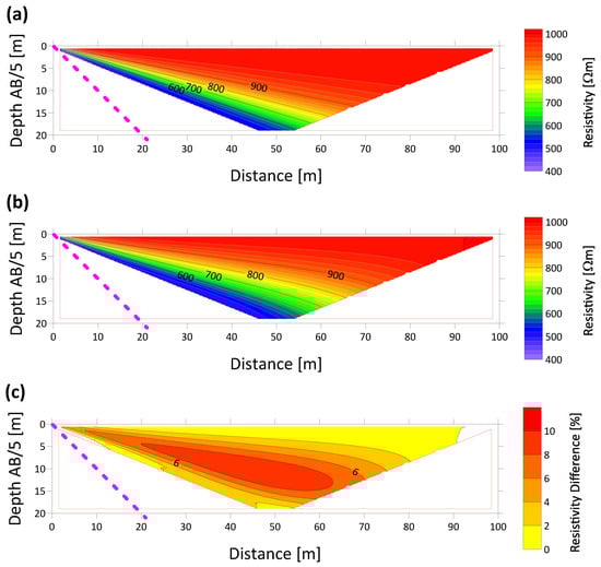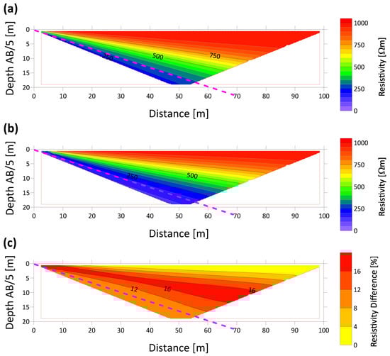 The comparison of analytical (a) and resistor network (b) apparent resistivity pseudo-sections. The dip of inclined conductive fault is 45°. The evaluation of resistor network model accuracy is shown in (c) as the difference between analytical and resistor network model resistivities—i.e., (a) minus (b) in percent of surrounding medium resistivity.