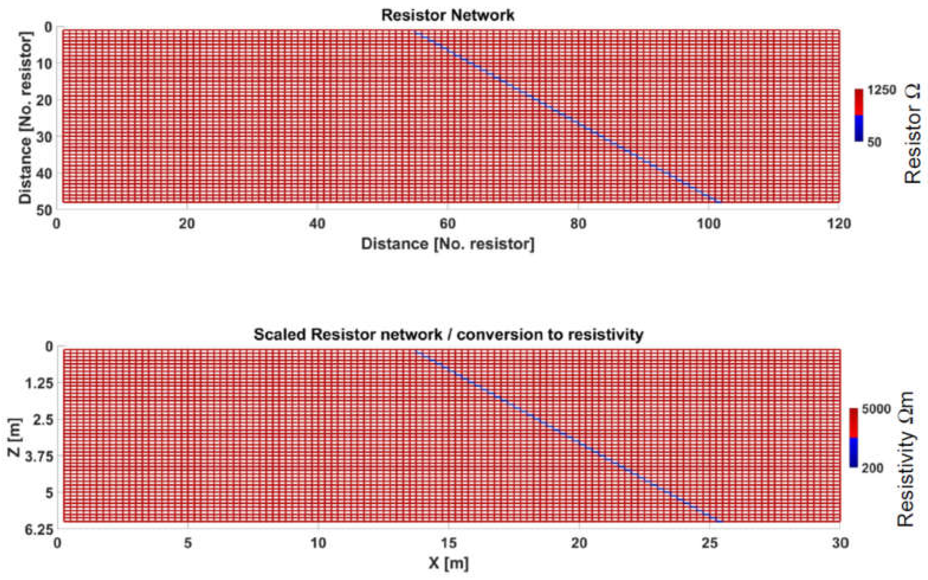 In the Res2Dmod, the geometrical shape of any inhomogeneity is created using rectangular cells with a specified anomalous resistivity value. The size of these cells is often chosen so that their vertical dimension increases with depth. This increase is supported by the decreasing effect of deeper uni-sized cells on the resulting apparent resistivity. However, such a depth-dependent geometry limits the possibility of modeling an inclined plate-shaped fracture. Therefore, a regular square mesh was used in the Res2Dmod program and for the resistor network mesh. The mesh cells’ size and resistors’ length were set to 0.25 m. The model was designed to be 60 m long and 5 m deep. Both model calculation algorithms automatically add damping zones behind the end of the model, on the sides, and below the model.