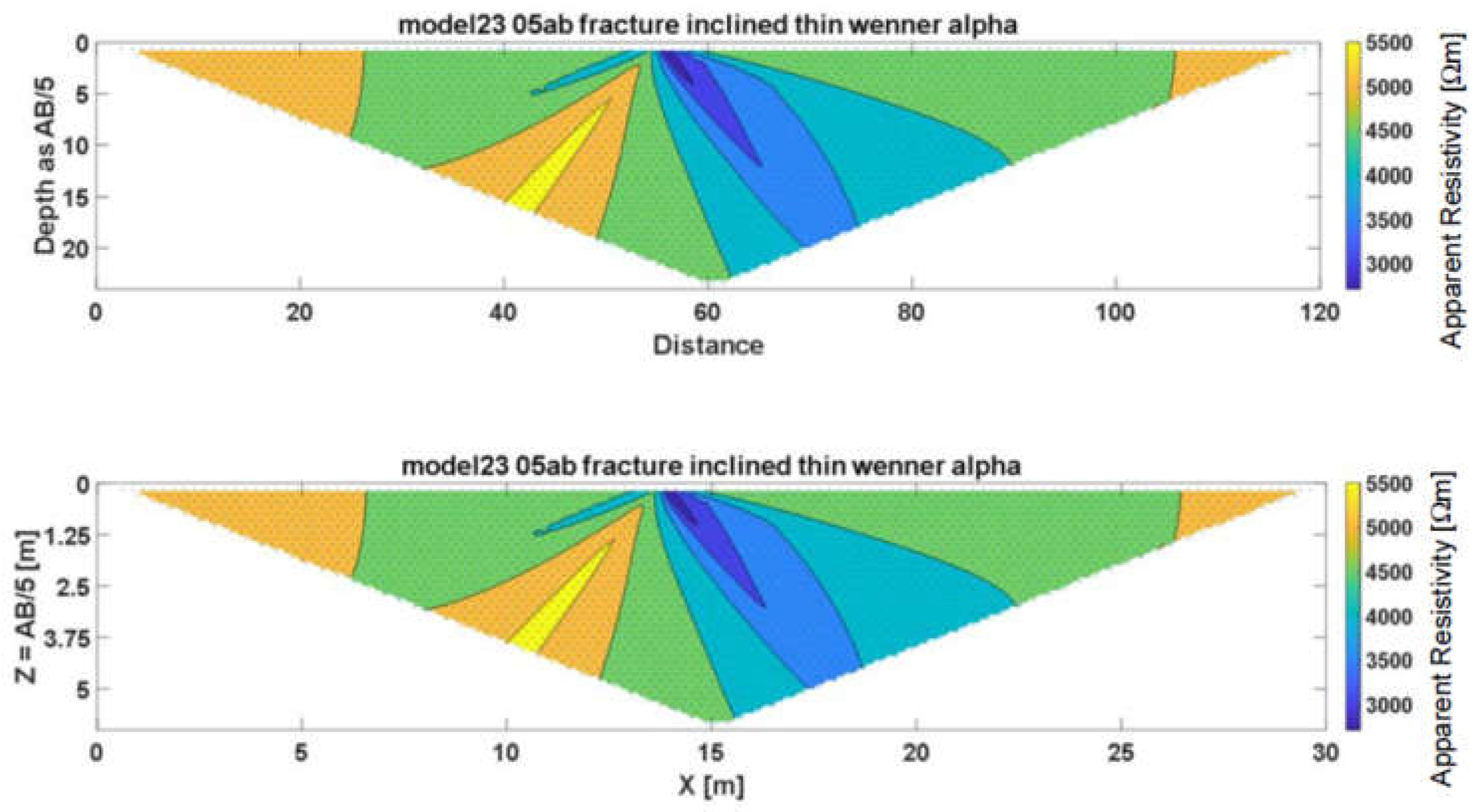 Generally speaking, the Res2Dmod and the resistor network model algorithms generate fairly stable apparent resistivity cross-sections calculated for the inclined conductive fracture zone while changing its thickness. The Res2Dmod sections tend to gradually smooth the fracture’s manifestation while decreasing the fracture zone thickness. A considerable difference between the apparent resistivity sections made by both model algorithms is a “mirrored” side-effect of a fracture. In this case, it is the zone on the right from the fracture outcrop to the surface. Res2Dmod generates the zone of anomalously decreased apparent resistivities, while the resistor network creates a zone of higher apparent resistivities. This zone of higher apparent resistivities is an effect of the electrical shielding influence of the conductive fracture.