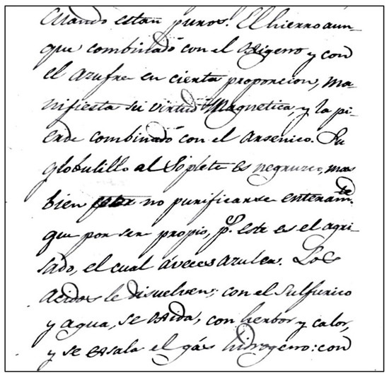 In the temporal context investigated, it was common to write an autobiographical cycle and a life memoir. Thus, Musso’s life memoir states that, to acquire a more complete knowledge in this field of studies, he attended, enrolling in, a Chemistry course under the direction of Antonio Moreno, solving the problems that were occasionally posed to the students, and writing a small dissertation on the pressures and temperatures of gases for Christmas [11] (p. 466). Additionally, the AGP manuscript contains a section titled Synoptic table of permanent gases. The relationship between Musso’s dissertation and the content of this section of the AGP manuscript should be the subject of future research. Furthermore, the stitched sheets titled analysis of minerals and instructions for ordering a collection are directly related to Donato García’s duties in the Mineralogy Chair [5]. Mineral assays were frequently used in the Cabinet and formed part of the priest’s teaching practice. Additionally, acquiring collections of minerals and rocks for both teaching and exhibition at the RGHN was a duty carried out by Professor García.