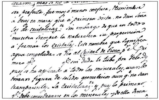 Section of lesson 2 “Lecciones de minerología explicada por D. Donato García en el Real Gavinete de historia Natural de Madrid, en el Curso que principió en 17 de diziembre de 1824” (Source: AGP, Infante D. Gabriel y sucesores, Anexo, legajo 4. Madrid).
