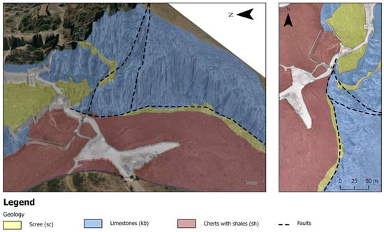 Geological map of the study area. Scree (sc): Loose-structured materials with a clayey to clayey-sandy composition and scattered shales. They originate from the erosion of the rocky background. Limestones (kb): Sublithographic, thick-plated to thin-bedded, in places dolomitized light-grey limestones with nodules or bands of cherts. Cherts with shales (sh): A system of thin-bedded cherts and shales with dark brownish-red color, which is bibliographically reported to develop within the main mass of Jurassic limestones. On the surface, they present a weathering mantle usually of small thickness.