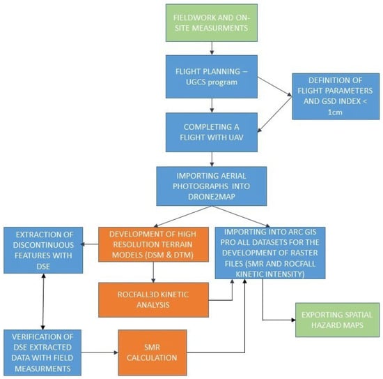 It must be noted that the 3D terrain model is created with ESRI’s ArcGIS-Drone2Map software (2024.2.1 version), which is directly connected to ArcGIS Pro software (3.4.3 version), for further processing and filling in data without any additional conversions. ArcGIS with its extensions is a widely used Geographic Information System (GIS) that enables the management, analysis, visualization, and integration of geospatial data [2,3,29]. By importing the terrain information into the ArcGIS Pro software, along with other important rock mass parameters, such as SMR and rockfall kinetic energy, in the form of raster files and superposing them, a spatial hazard map is finally produced. The methodological process is presented below as a flow chart (Figure 3).