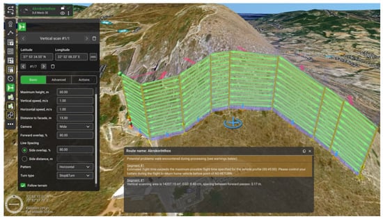 All the above parameters contribute to the small value of the GSD index, which concerns the sharpness of the photos. When planning the flight through the UgCS program, a budget is made for the GSD index in order to achieve the necessary index. It is worth noting that in this case, due to the existing steep slopes, a vertical flight was performed. Overall, through programming with the UgCS software version 5.5.0, the flight time was minimized, and the minimum possible value of GSD for the accuracy of the 3D terrain model was achieved. By minimizing the GSD index, a more representative representation of the study ground and more accurate information about the discontinuity system are achieved.