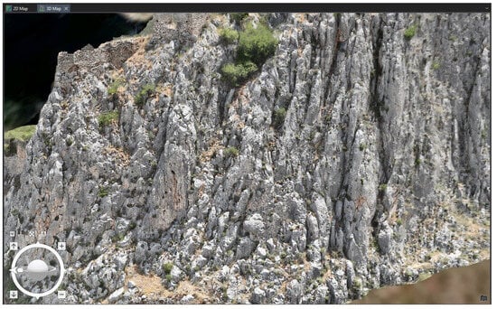 Figure 6 shows an enlarged section of the created 3D terrain model of Acrocorinth, and Table 1 presents the types of files created by the Drone2Map software. With the viewing tools provided by the program, we can focus as much as we need and easily observe the rock mass discontinuity details that have been captured based on the design mentioned above. Moreover, the program gives the option to create a DSM (Digital Surface Model) and a DTM (Digital Terrain Model), which are useful for subsequent analysis in the Rocfall3 program for the kinetic study of rock falls. The basic file types that are created and are easy to use are the las and obj formats.