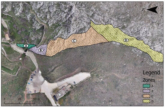 Preliminary delimitation of the study area. Zone A is relatively low in height, located to the right of the entrance to the archaeological site, where there is also a small footbridge. Zone B is located in the continuation of Zone A in a southwesterly direction and has a higher elevation than Zone A. It is located close to a footpath between the parking area and the footbridge. According to officials’ testimonies, falling rocks are noted at regular intervals, which are dangerous for visitors to the site. Zone C is a continuation of Zone B in a southeasterly direction until the slope changes direction. The height towards this direction continues to increase, without any serious human activity observed. Several visitors take walks around the perimeter of this zone, and a parking area and shop exist downslope. According to officials’ testimonies, sparse falling rocks have been noted, which are dangerous for the visitors. Zone D is located southeast of Zone C, outside the perimeter of the archaeological site, and lower than Zone C.