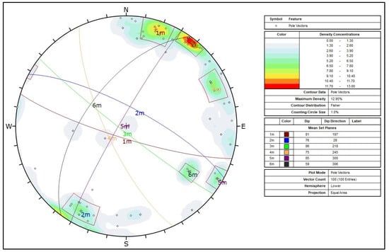 In addition, field work carried out over the entire area of the rocky slope of Acrocorinth created a record of 100 measurements of discontinuity planes along with their features (orientation in dip/dip direction, aperture, spacing, continuity, etc.). All the recorded data were then imported into the Rocscience Dips program for further analysis, and the following results were exported (Table 3 and Figure 9).