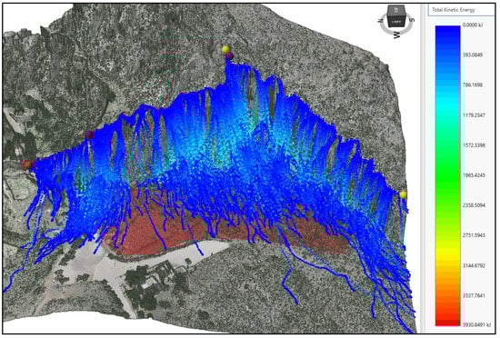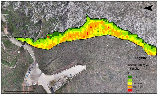 The results of the rockfall simulations executed in the entire area of research are given in Figure 10, in terms of the kinetic energy of the detached rocks. These results were imported into the ArcGIS Pro software in ASCII format for the relevant raster calculations.