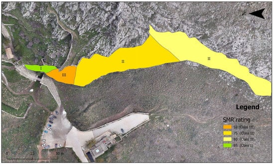Generally, five distinct rock mass classes are proposed based on the SMR system [40,44]. Class V (SMR < 20) is categorized as very poor, typically associated with large planar or soil-like failures. Class IV (SMR between 20 and 40) is considered poor, where planar failures and large wedge instabilities may occur. Class III (SMR between 40 and 60) is described as fair, necessitating systematic support for both joints and wedges. Class II (SMR between 60 and 80) is rated as good, generally requiring only localized or occasional support for specific blocks. Finally, Class I (SMR between 80 and 100) represents very good or completely stable conditions, where no support measures are deemed necessary.