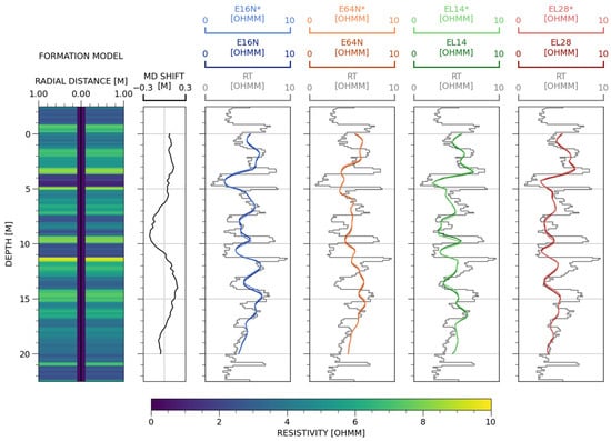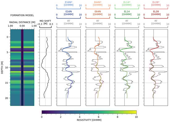 Synthetic dataset 2: Formation model of a thin-bedded interval and corresponding synthetic normal (E16N, E64N) and lateral (EL14, EL28) resistivity logs. Logs marked with * indicate misalignment between true and assigned measurement depths (shown by MD SHIFT), while RT logs depict the true resistivity of individual beds.