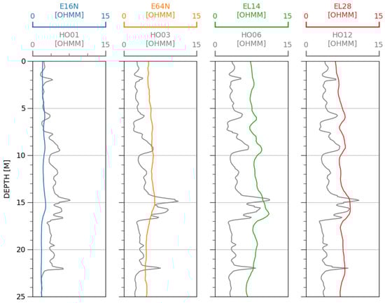 Field dataset 2: Comparison of normal (E16N, E64N) and lateral (EL14, EL28) resistivity logs with HRAI (HO01, HO03, HO06, HO12) resistivity logs.