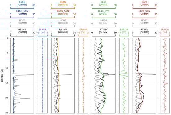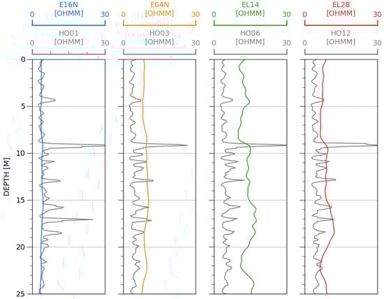 Figure 9 and Figure 10 present the inversion results for four legacy resistivity logs (E16N, E64N, EL14, and EL28) from a borehole in the Eastern Carpathians, Poland, along with relatively modern HRAI logs. The results from the two analyzed intervals are very similar and, therefore, will be discussed jointly, although notable differences related to the geological complexity of each interval are highlighted. An important consideration in these comparisons is that, as discussed earlier, a systematic difference in the measured resistivity values exists between the normal and lateral logging tools and the HRAI logging tool. Consequently, the evaluation of inversion quality is based on the qualitative assessment of the relative similarity of the observed patterns rather than the absolute resistivity values.