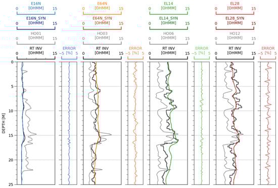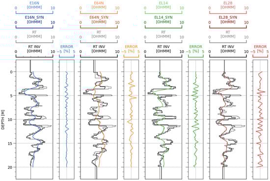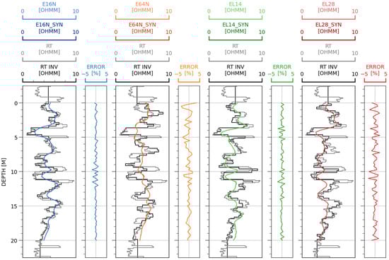 Results of inversion of normal (E16N, E64N) and lateral (EL14, EL28) resistivity logs from synthetic dataset 1 with the assumption of the correct assignment of measurement depths and correct mud resistivity. The suffix _SYN appended to a log name denotes a synthetic version of the log generated during the inversion process. RT INV logs depict the resistivity of individual beds in the formation model obtained as a result of the inversion procedure, while RT logs depict the true resistivity of individual beds. ERROR logs present relative errors between input resistivity logs and synthetic logs generated during the inversion procedure.