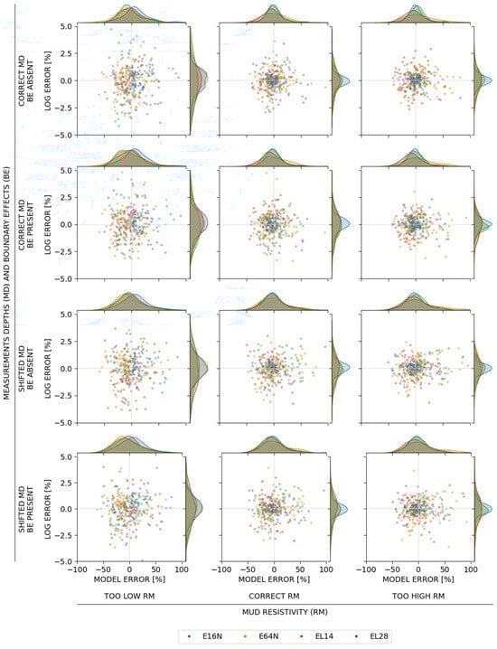 Statistical presentation of results of inversion procedure of synthetic normal (E16N, E64N) and lateral (EL14, EL28) resistivity logs affected by different factors. Scatter plots show relative model error (difference between resistivity of the formation model and resistivity of the model obtained as a result of the inversion procedure) and relative log error (difference between input resistivity log and synthetic log generated during the inversion procedure), complemented by kernel density estimation (KDE) plots of each parameter distribution.