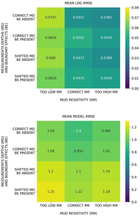 Overall, the top row and center column of Figure 7 represent the idealized scenario (correct mud resistivity, correct measurement depths, and no boundary effects), with the smallest scatter in both the model and log errors. Departures from these ideal conditions, whether due to incorrect mud resistivity, boundary effects, or depth misalignments, result in broader and/or skewed distributions, shifting them away from zero. The RMSE heatmaps in Figure 8 further quantify these effects, confirming the relative importance of each factor and highlighting the complex ways in which inversion quality depends on data quality.