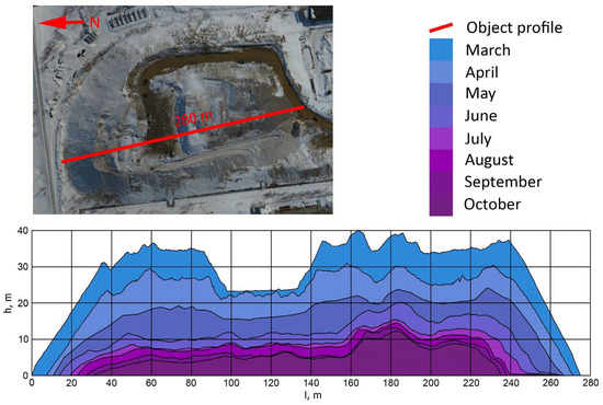 Observations of the Northern snow dump started in 2010. As a part of observations, we have been conducting monthly aerial surveys on snow dumps since 2018. Monthly aerial surveys that were carried out made it possible to track the dynamics of the morphometric characteristics of snow dumps and build chronological 3D models. The aerial photographic survey usage allows us to reduce or avoid the risks associated with heavy equipment (excavators and dump trucks) operating on snow dumps in winter 24 h a day. In addition, in spring and summer, carrying out measuring activities on the ground poses a risk of injury due to snow melting, which leads to cracks and sink formation in the snow and ice core, as well as the risks from melted-out household waste including glass shards and metal objects.