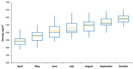 Monthly distribution of the snow density at the snow patch surface during studied period.