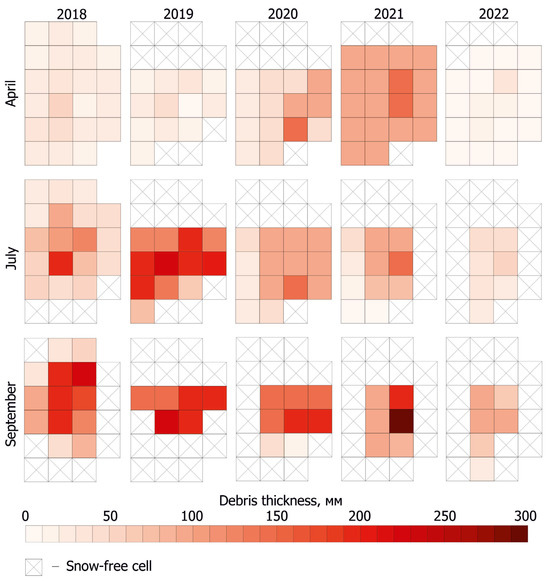 The debris layer thickness over different years: for the beginning (April), the middle (July) and the end (September) of melting season.