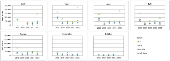 A distinguishing feature of this model is its tendency to reduce monthly melting volumes post-May. It is the most noticeable for the August–September period (Figure 6). The results of calculations have a significant value divergence in a range from 0.0- to 3.6-times for single months. However, the factual melting volumes are not high at the end of the warm period, similarly to the ETI model, and lowering these volumes does not contribute noticeably to the total volume of melted snow. Annual divergences from the factual values were as follows: 2018—−11%; 2019—−19%; 2020—−2%; 2021—−10%; 2022—−43%.