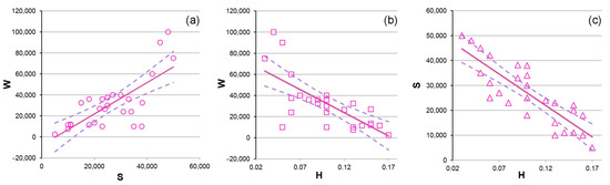 Correspondence between the chosen parameters with strong correlation: (a) W and S; (b) W and H; (c) S and H. Pink line shows the best approximation by linear regression, and the dotted line marks 95% confidence interval.