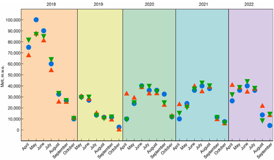 In our case, the parameters lagT and lagI added to the ETI formula proposed by Pellicciotti et al. [14] did not have a noticeable effect on the results. The values calculated by these models differed by 0.1–0.2% for all months. This difference is negligible compared to the annual melting volumes. Annual differences between the calculated and factual volumes in water closely agreed with the ETI (Figure 6) and were as follows: 2018—1%; 2019—−11%; 2020—−9%; 2021—15%; 2022—31%. The following values were taken from the study of [15] for modeling: lagT, lagI, TF and SRF.