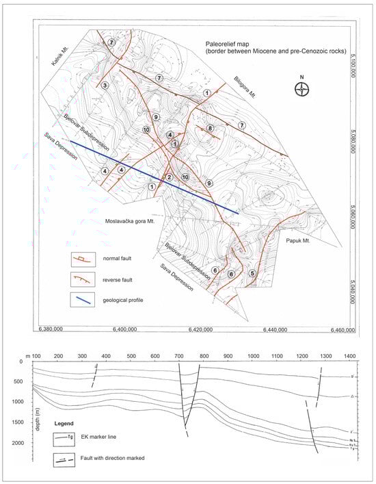 Locations of main structures and faults in the Bjelovar Subdepression’s Neogene and Quaternary sediments [5,46]. Fault numbers correspond with Table 1.