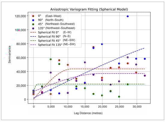 A variogram analysis was performed with the pykrige [51] and scikit learn [52] packages, which internally support six different variogram models. After testing, the spherical model was chosen and calculated for several scenarios, as shown in Figure 3. The analysis reveals a clear anisotropy [53,54,55]. The east–west direction (0°) shows the highest variability, with a steep increase and a high sill, indicating that spatial dependence decreases quickly over shorter distances. Additionally, the north–south direction (90°) exhibits a near-linear model without reaching a clear sill, suggesting that variability continues to increase with distance and that there is no clear spatial link among the data. However, two other models showed easier interpretable results. The perpendicular direction (45° NE-SW), which also follows the secondary axis of the subdepression, shows a model with low range but also a sill, and are both quite easily interpreted. Eventually, the main subdepressional axis, i.e., the longitudinal one (135° NW-SE), showed the best fit, with a clearly defined range (larger than in the perpendicular axis) and sill.