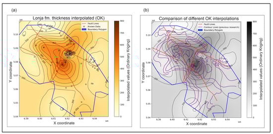 The OK maps of the e-log marker D’ depths (the shallowest Lonja Formation thickness). (a) Map interpolated in this research with pykrige [5,52]. (b) Map from previous research (Figure 1) [5,52].