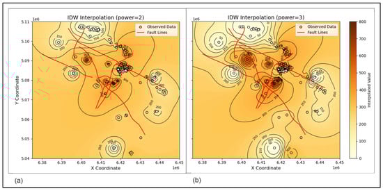 Along with OK, a simpler interpretation model was applied. IDW is a straightforward method where the unknown value of a variable is estimated based on known values within a defined search radius. This search area can be either a circle or an ellipse, including some or all data points, depending on geological or other criteria. It is mostly used by including all relevant points within the area. Each data point’s influence is weighted inversely to its distance from the unknown value, ensuring that closer points have more influence on the estimate [56].
