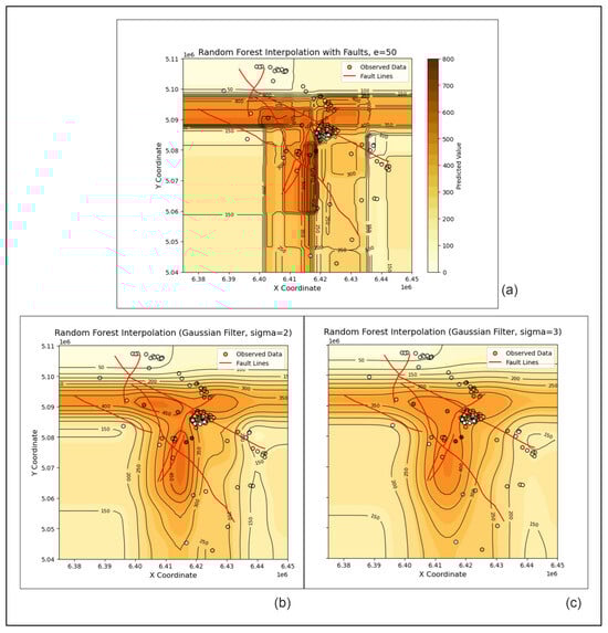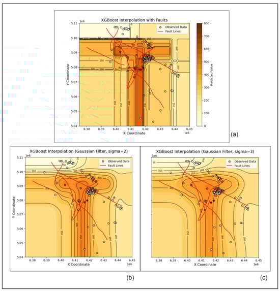 Both RF and XGB created interpolation surfaces based on decision trees, which inherently partition the feature space into discrete, box-like regions. This resulted in sharp, abrupt transitions between predicted values, which did not reflect the natural gradual transitions among structural contours (Figure 8a and Figure 9a). The sharp breaks did not even follow the major fault zones, which makes these representations completely inapplicable to the geological mapping of the Bjelovar Subdepression. However, some improvements were achieved with the use of the Gaussian filter for smoothing (Figure 8b,c and Figure 9b,c) because the filter effectively reduces local noise and artificial discontinuities, ensuring that the interpolated surface respects the inherent spatial correlation of subsurface layers. Thus, the results are still of use for geological mapping.