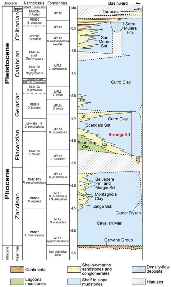 The Plio-Pleistocene part of the sedimentary succession of the Crotone Basin (modified from Zecchin et al. [,]), compared with the IUGS International Chronostratigraphic Chart (https://stratigraphy.org/ICSchart/ChronostratChart2021-05.pdf (accessed on 12 March 2025)), and the calcareous nannofossil and planktonic foraminifera biostratigraphic schemes [,,,]. The studied succession (the Strongoli 1 section) comprises the lower part of the Piacenzian Cutro Clay and the Gelasian Strongoli Member of the Scandale Sandstone. Abbreviations: Ca: Casabona Member; Rn: Rocca di Neto Member; St: Strongoli Member.