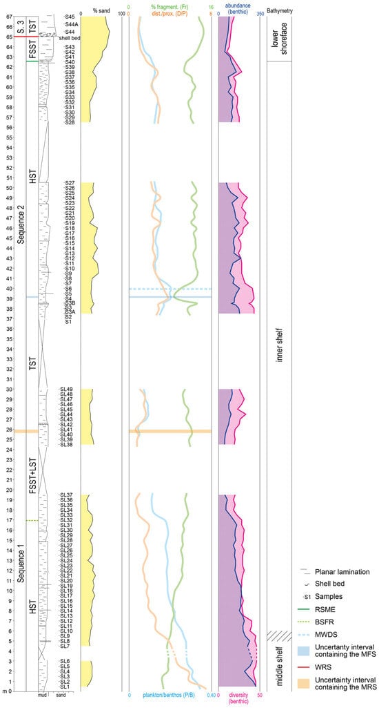 Similarly to Zecchin et al. [,,,], who defined an uncertainty interval containing the MFS between a relative maximum of the D/P curve and a relative minimum of the Fr curve, another uncertainty interval is introduced here between a relative minimum of the D/P curve and a relative maximum of the Fr curve, which should contain the maximum regressive surface (MRS) [], in this case just below 26 m from the base of the section and ca. 0.3 m thick (Figure 4). It should be noted that the resolution provided by the ‘abundance’ and ‘diversity’ curves does not allow such a thin interval to be defined but only a relatively large interval of minimum values between ca. 18 and 26 m from the base (Figure 4).
