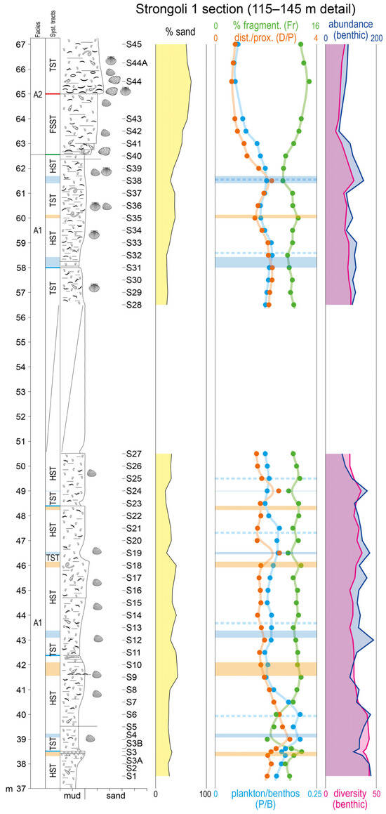 An abrupt bathymetric lowering is highlighted by a rapid decrease in the P/B parameter at ca. 17 m from the base (Figure 4), and this is also accompanied by a similarly marked decrease in the D/P, ‘abundance’ and ‘diversity’ parameters, and by an increase in the Fr parameter, suggesting an overall acceleration in the regressive trend probably accompanied by relative sea level fall. Such evidence suggests that the gradual regressive trend found between the base of the section and ca. 17 m reflects highstand progradation (highstand systems tract, HST), followed by forced regression (falling-stage systems tract, FSST) (Figure 4). A basal surface of forced regression (BSFR) [] is therefore inferred to be placed at ca. 17 m, at the beginning of the abrupt bathymetric decrease (Figure 4).