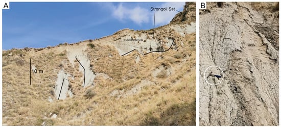 (A) Field detail of the upper part of the measured section (black lines; see Figure 6) documenting part of the Cutro Clay and the sand interval representing the lowermost part of the Strongoli Sandstone (modified from Zecchin et al. []). (B) Detail of silt with faint planar lamination in the Cutro Clay.