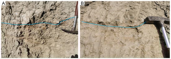 The studied deposits consist of part of the Piacenzian–Gelasian succession found in the northern part of the Crotone Basin, composed of the lower part of the Cutro Clay and the Strongoli Sandstone (also known as the Strongoli Member of the Scandale Sandstone []), which are, respectively, ca. 150 m and 70 m thick in the study area (Figure 1B,C, Figure 2 and Figure 3). These units were previously described by Roda [], Capraro et al. [] and Zecchin et al. [,,], and they document a regressive trend from slope to shoreface settings (Figure 3). The studied interval of the Cutro Clay and Strongoli Sandstone succession is 67 m thick and starts at ca. 78 m from the base of the main section (Figure 3, Figure 4, Figure 5 and Figure 6). Facies and depositional environments of the studied interval are illustrated in Table 1.