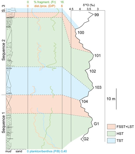 The upper part of the succession between 62.5 and 67 m, containing the FSST of the higher rank Sequence 2 and the TST of Sequence 3 (Section 6.1; Figure 4 and Figure 9), cannot be further subdivided, and such system tracts are considered also for the lower rank sequences (Figure 6).
