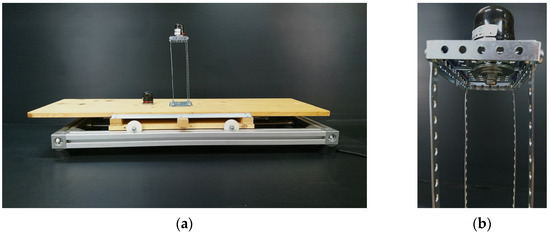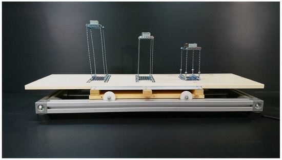 The upper platform, which supports the models to be tested, is a wooden plank measuring 30 × 70 cm. It is attached to the carriage with clamps that can be easily removed. When different models need to be tested in sequence, the current wooden platform is replaced with another that holds the new models.