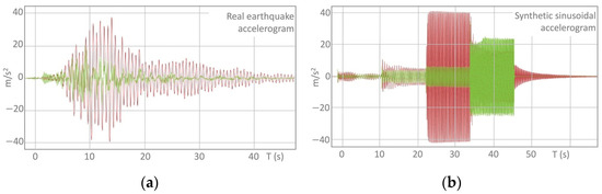 Recordings of forced vibration tests from Experiment 1. Accelerometer at the base (green) and on top (red) of the model. (a) Accelerograms from a real recorded earthquake, (b) accelerograms from sinusoidal input.