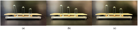Experiment 2. Three frame structures with different heights placed on the shaking platform. When one model is in resonance, the others show minimal movement: (a) resonance of the tallest model, (b) resonance of the medium-height model, (c) resonance of the shortest model.