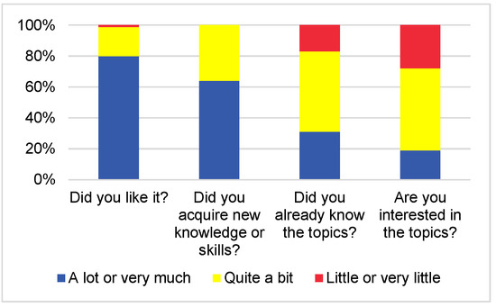 Of the 92 students interviewed in the 2024 edition, 93% expressed interest in participating in similar events again. For 72% of the students, the most appreciated learning module was Shake it!. The questionnaire focused primarily on the overall event. Eighty percent of students reported enjoying the event “a lot” or “very much,” and 64% felt they had gained “a lot” or “very much” new knowledge. Seventeen percent indicated that the topics were “little” or “very little” known to them beforehand. Twenty percent were “a lot” or “very much” interested in the topics covered, while about 25% reported being “little” or “very little” interested (Figure 7).