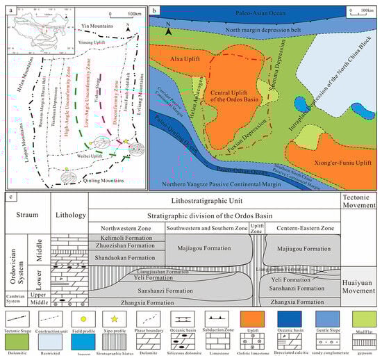 (a) Tectonic setting of the Ordos Basin and the planar distribution of the unconformities, modified from [7]. (b) Paleogeographic distribution and sedimentary facies belts during the depositional period of the Liangjiashan Formation in North China, modified from [20]. (c) Distribution of the Cambrian–Ordovician unconformities in the Ordos Basin, modified from [21].