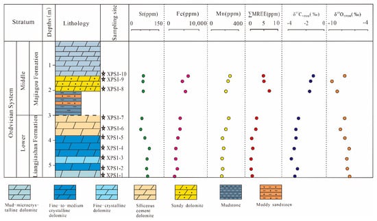 The results of the major and trace elements analyses of the carbonate components are shown in Table 1. The Sr values of the sandy dolomite range from 61 ppm to 77 ppm, with an average value of 68 ppm. The Sr values of the siliceous-cemented dolomite range from 51 ppm to 60 ppm, with an average value of 55 ppm. The Sr values of the crystalline dolomite range from 74 ppm to 98 ppm, with an average value of 86 ppm. The results show that the Sr content of the sandy dolomite is comparable to that of the siliceous-cemented dolomite, while the crystalline dolomite has a higher Sr content than the other two types of dolomites. The Sr content in the profile exhibits significant variations (Figure 4). Within the dolomite of the Liangjiashan Formation, a distinct pattern is observed where the Sr content initially increases and subsequently decreases, ultimately stabilizing upon reaching the upper-siliceous-cemented dolomite.