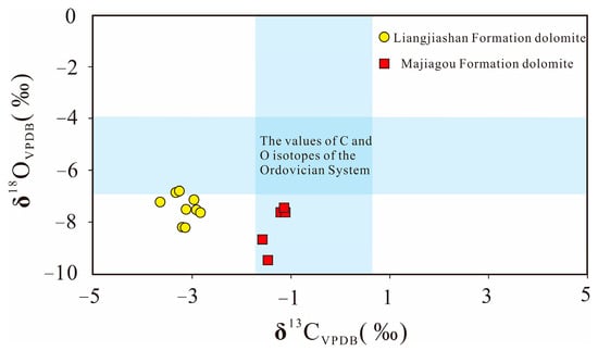 The carbon and oxygen isotopic data are shown in Table 1 and plotted in Figure 5. The δ13CVPDB values for the sandy dolomite, siliceous-cemented dolomite, and crystalline dolomite range from −1.57‰ to −1.12‰ (avg. −1.21‰), −3.18‰ to −2.83‰ (avg. −3.02‰), and −3.64‰ to −2.97‰ (avg. −3.27‰), respectively. The δ18OVPDB values for these three types of dolomites range from −9.49‰ to −7.45‰ (avg. −8.06‰), −8.21‰ to −7.54‰ (avg. −7.89‰), and −7.52‰ to −6.80‰ (avg. −7.11‰), respectively. According to previous studies, the δ13CVPDB values of Ordovician seawater have been found to range from −2.00‰ to 0.50‰, while the δ18OVPDB values range from −6.60‰ to −4.00‰ [25]. The siliceous-cemented dolomite and crystalline dolomite in the Liangjiashan Formation exhibit more negative δ13CVPDB and δ18OVPDB values compared to the contemporaneous Ordovician seawater, whereas the sandy dolomite in the Majiagou Formation shows a comparable δ13CVPDB value with the contemporaneous Ordovician seawater, but a more negative δ18OVPDB value than that of the contemporaneous seawater (Figure 5).
